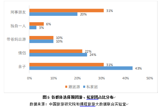 《报告》显示,亲子、情侣和带爸妈出游群体更偏爱选择私家团。其中,亲子占比最高,为43%,情侣居其次,为24%;带爸妈出游占比10%。亲子家庭人群中,选择私家团的比例比跟团游多12%。