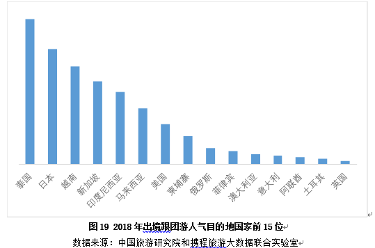 哪些目的地最受出境跟团游游客欢迎?报告发布2018年出境跟团游TOP15人气目的地国家,依次是泰国、日本、越南、新加坡、印度尼西亚、马来西亚、美国、柬埔寨、俄罗斯、菲律宾、澳大利亚、意大利、阿联酋、土耳其和英国,泰国、日本、越南等周边国家仍然受到中国游客热捧。