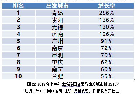 出境跟团游,哪些城市涨幅最快?报告发布了2019年上半年出境跟团游十大黑马出发城市,依次是青岛、贵阳、无锡、济南、广州、南京、昆明、重庆、南宁以及合肥。