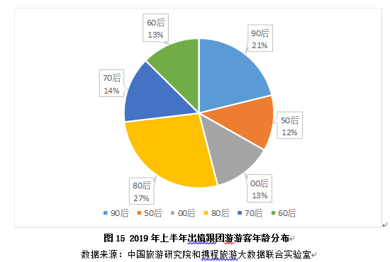 虽然50后、60后游客依然是出境跟团游的重要组成部分,但年轻化已是出境跟团游的显著趋势,《报告》显示,2019年上半年通过平台报名跟团游产品出境旅游的90后、00后年轻群体占比34%,相较于2018年同期年轻群体占比增长了5%。如果加上80后,那么40岁以下在出境跟团游中占比达到了61%。十个跟团游客中六个是年轻人。
