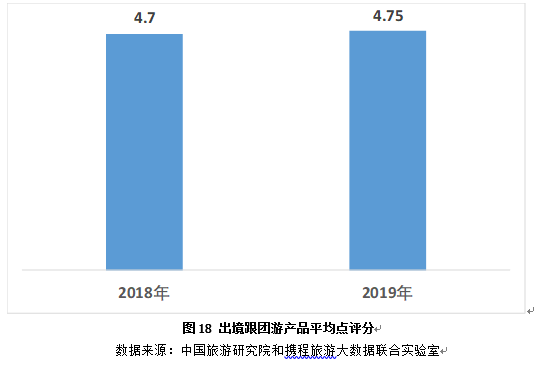 根据携程网站和APP百万级条真实用户点评数据,出境跟团游产品平均点评分4.75分(满分5分),相较2018年上涨0.05分。相当于满意度指数为95%。包括总体评分、领队服务、导游讲解、交通线路、住宿餐食等5大评分维度。