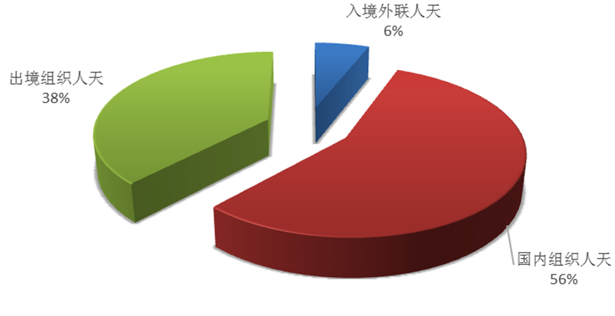 按照入境外联人天、国内组织人天、出境组织人天三项指标,入境旅游、国内旅游、出境旅游市场人天所占份额依次为6%、56%、38%(见图8)。(来源:中华人民共和国文化和旅游部官网)