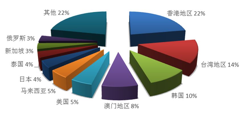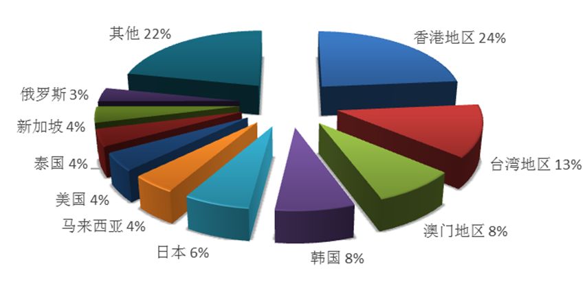 图3:2019年上半年入境旅游接待人次排名前十位的客源地国家或地区