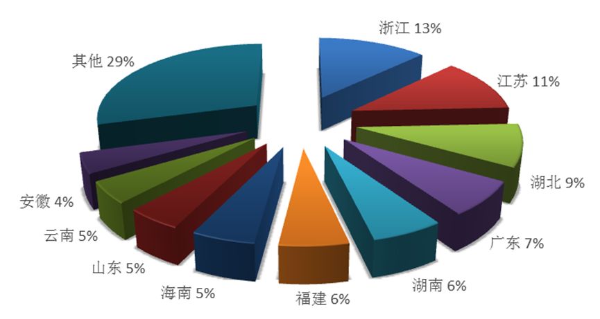 2019年上半年旅行社国内旅游接待人次排名前十位的地区由高到低依次为浙江、江苏、湖北、广东、湖南、福建、海南、山东、云南、安徽(见图5)。